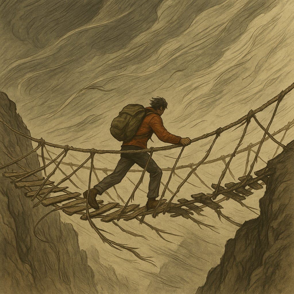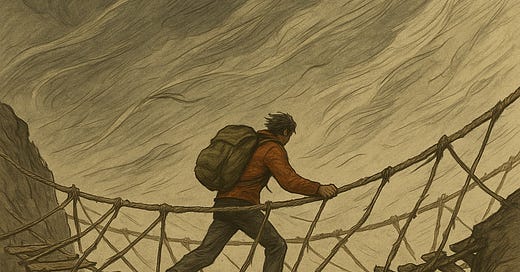 A traveler is crossing a long, narrow rope bridge stretched between two cliffs.